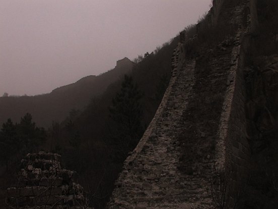 Liang Narrative Landscape Narrative Landscape ist ein Werk über die Chinesische Mauer. Im Vergleich zu Regentropfen auf einem Lotusblatt oder anderen üblichen Videos ist dieses filmische Poesie. Es beginnt mit Berghügelketten in düsteren Farbtönen, gewaltig und düster, ein Bild von Einsamkeit. Begleitet von Vogelzwitschern lassen sich allmählich die Windungen der Chinesischen Mauer auf den Bergrücken ausmachen. Mit näher rückender Kamera sehen wir, dass nur noch Bruchstückeder Ruine vorhanden sind. Der Wind nimmt zu und bringt Bäume und Wildgräser zum Tanzen. In der Ferne braut sich ein Sandsturm am Himmel zusammen und fegt in unsere Richtung, während der Wind unnachgiebig gegen das Mikrofon schlägt, sodass der Sandsturm in der Ferne wirkt wie eine tösende Kavallerie im Anmarsch. Die letzte Szene ist eine Nahaufnahme der Ruine: eine zarte Blume schaukelt im Wind, das Vogelgezwitscher ist immer noch hörbar, der Frühling scheint nah; und dennoch strahlen der Himmel und die Berge nur Trostlosigkeit aus. Der technische Fehler der hörbaren Windböen am Mikrofon steigert in diesem Fall die Wirkung der Bilder. Narrative Landscape is a piece about the Great Wall. In comparison to raindrops on a lotus leaf or other videos of the quotidian, this one resembles filmic poetry. It commences with mountain ranges in grim tones, vast and obscure, an image of desolation. With the bird’s chirping, we gradually see the flowing Great Wall on the spine of the mountains. As the camera draws closer, we see there is nothing but remnants of the ruin. As the wind picks up, trees and wild grass dance with the wind. In the distant sky, a sandstorm rushes towards this direction, and the wind gusts relent lessly towards the microphone, making this sandstorm in the distance resemble a roaring cavalry marching forward. The final shot is a close-up of the remnant ruins: a feeble flower swings with the wind, one can still hear the vague chirping of the birds, spring seems to be on its way, but the sky and the mountains are nevertheless desolate. The technical mistake of hearing gusting wind against the microphone in this case compliments the images of the work. |